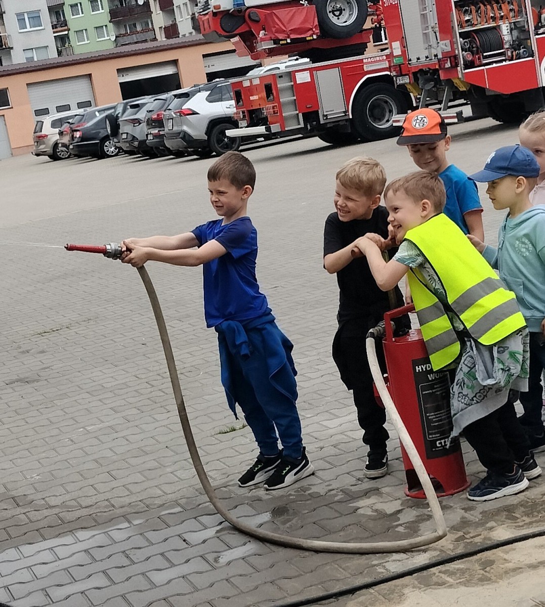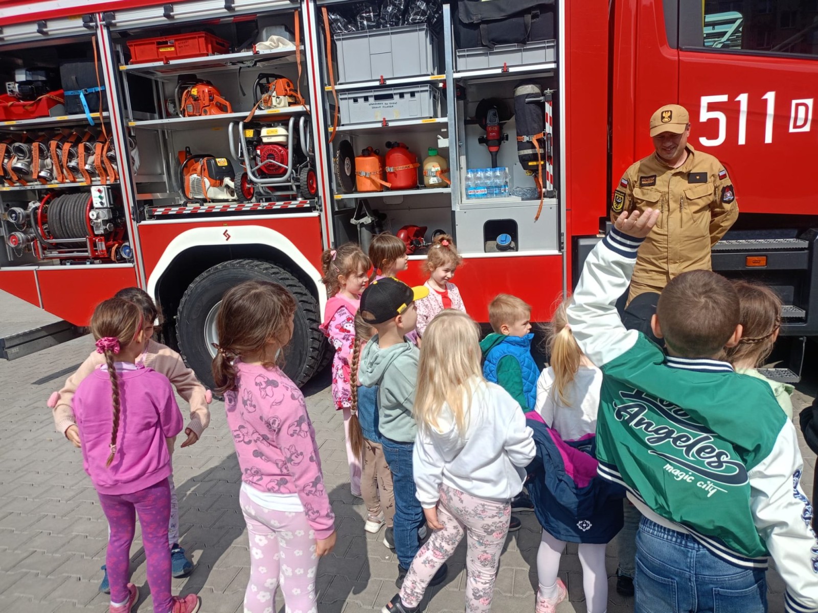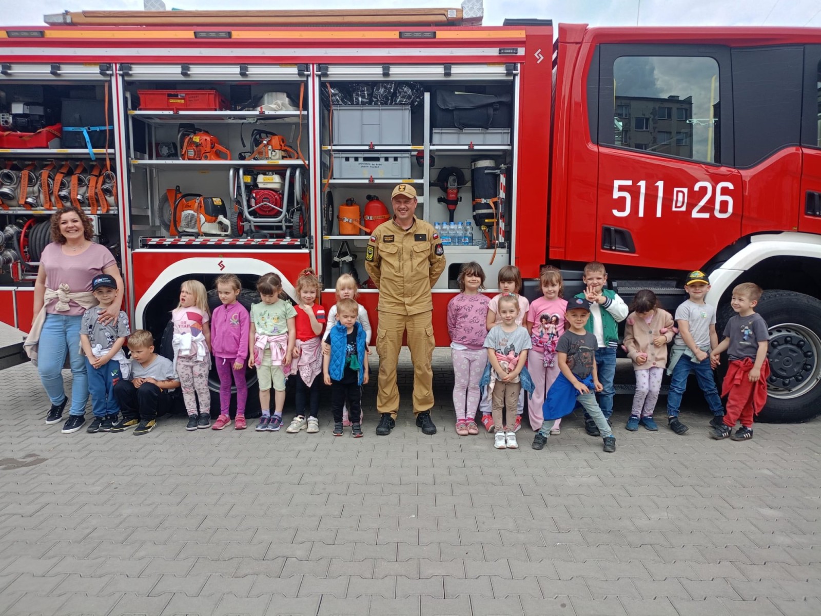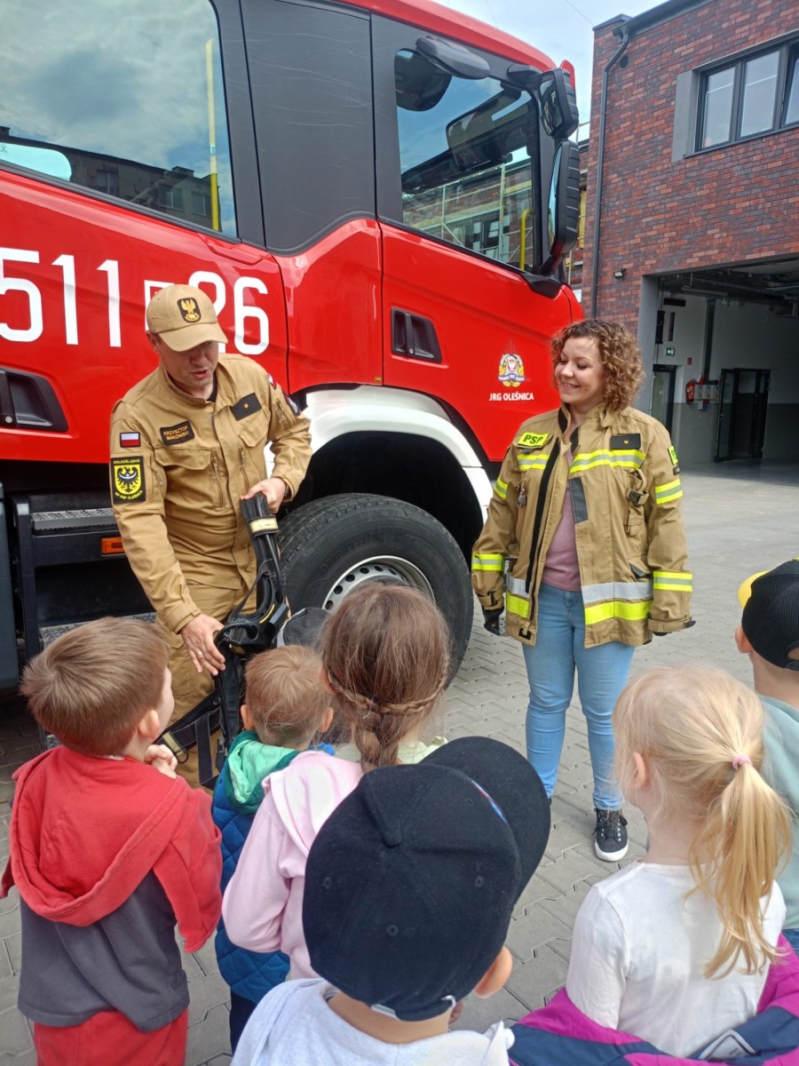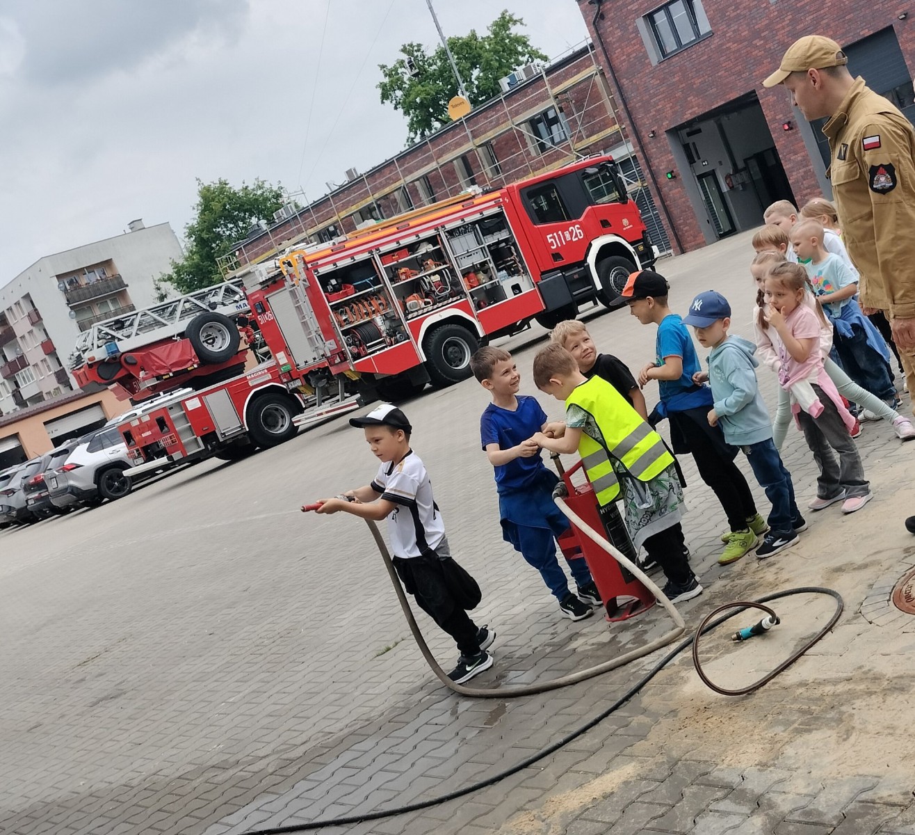 W dniu 21 maja dzieci z grup Nutki i Puchatki wybrały się na wycieczkę do Komendy Powiatowej Państwowej Straży Pożarnej w Oleśnicy. Dzięki życzliwości strażaków przedszkolaki obejrzały wozy strażackie i sprzęt pożarniczy stanowiący wyposażenie jednostki. Wszyscy chętni mogli również sprawdzić się w roli strażaka, trzymając w rękach prawdziwy wąż strażacki.