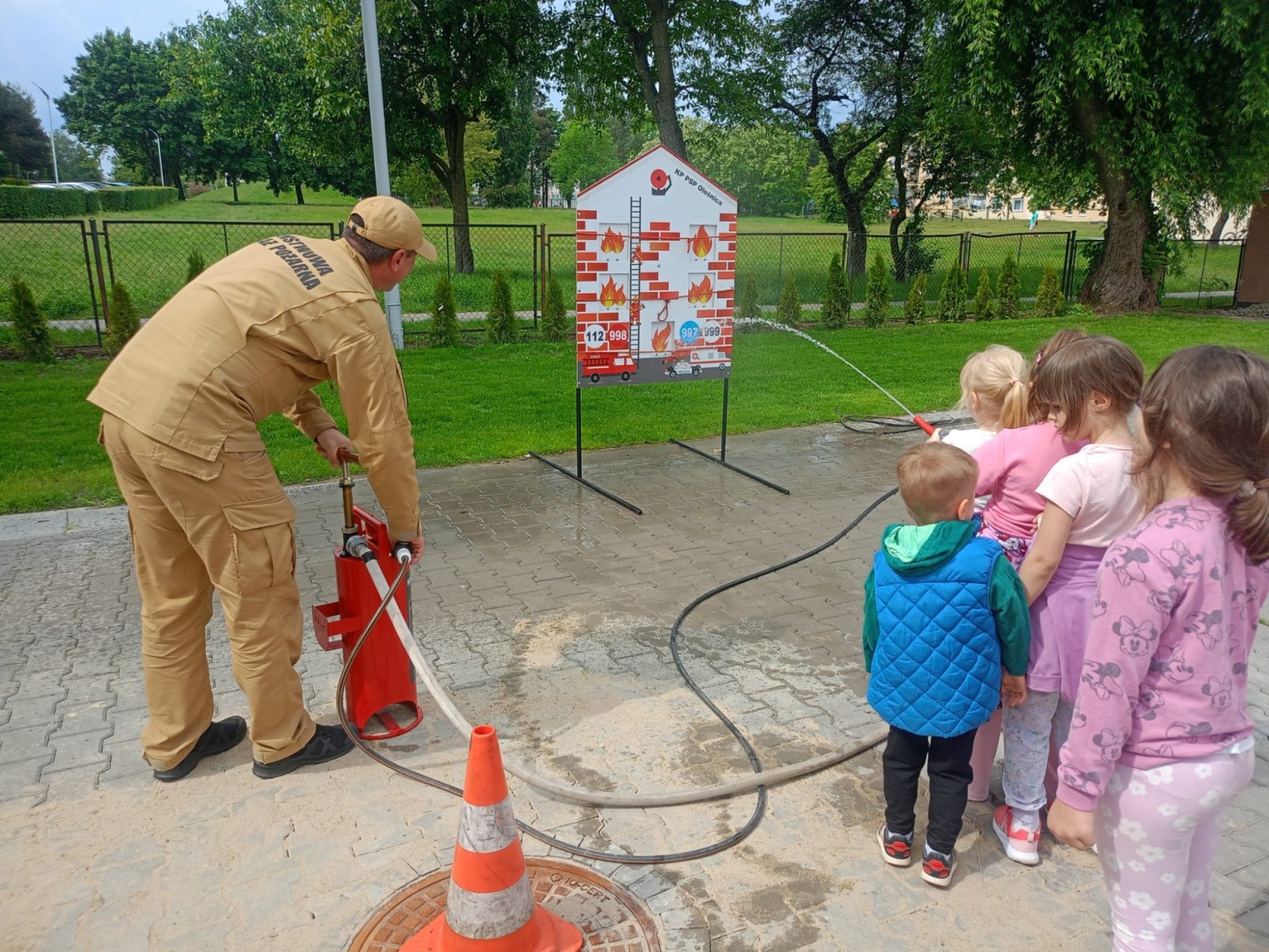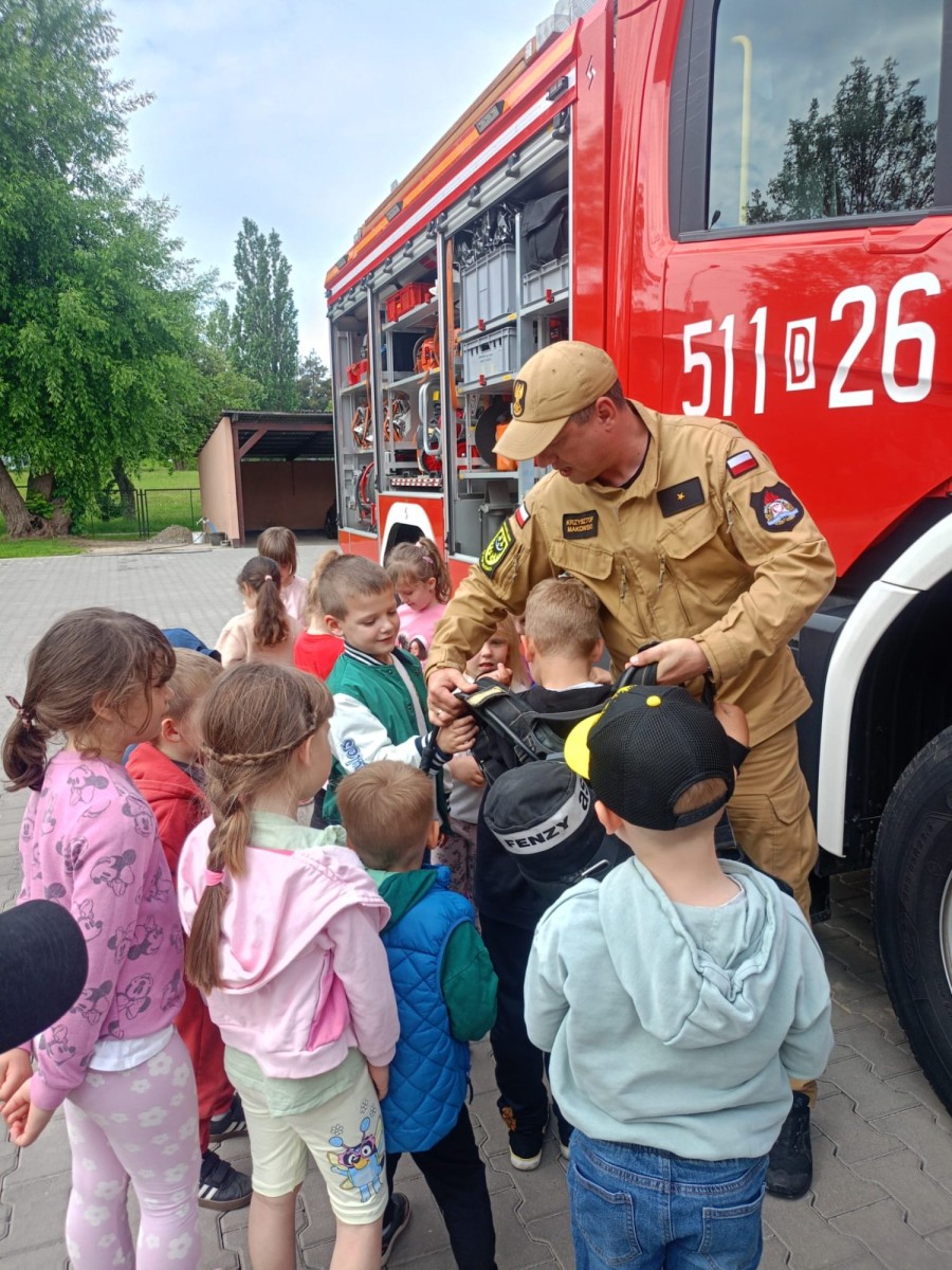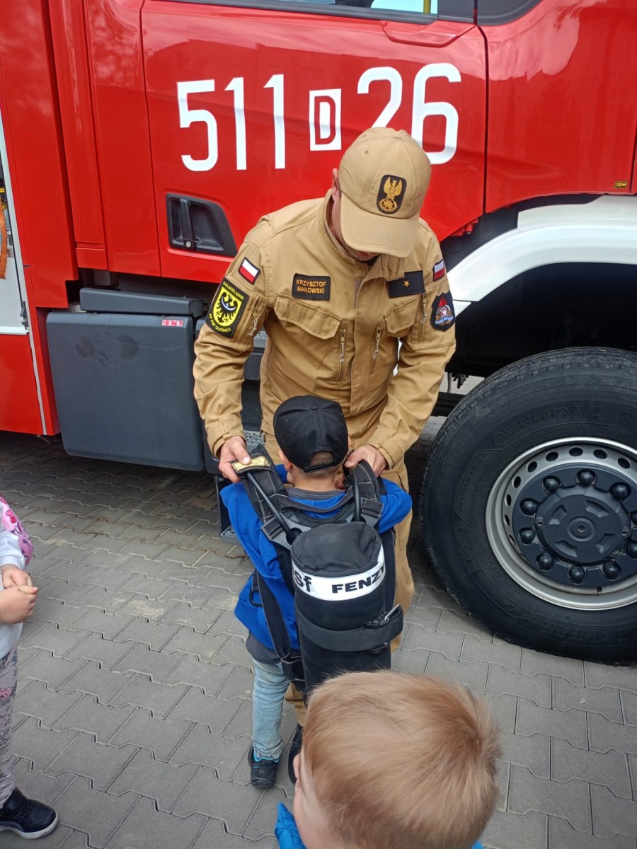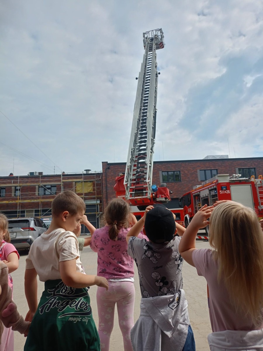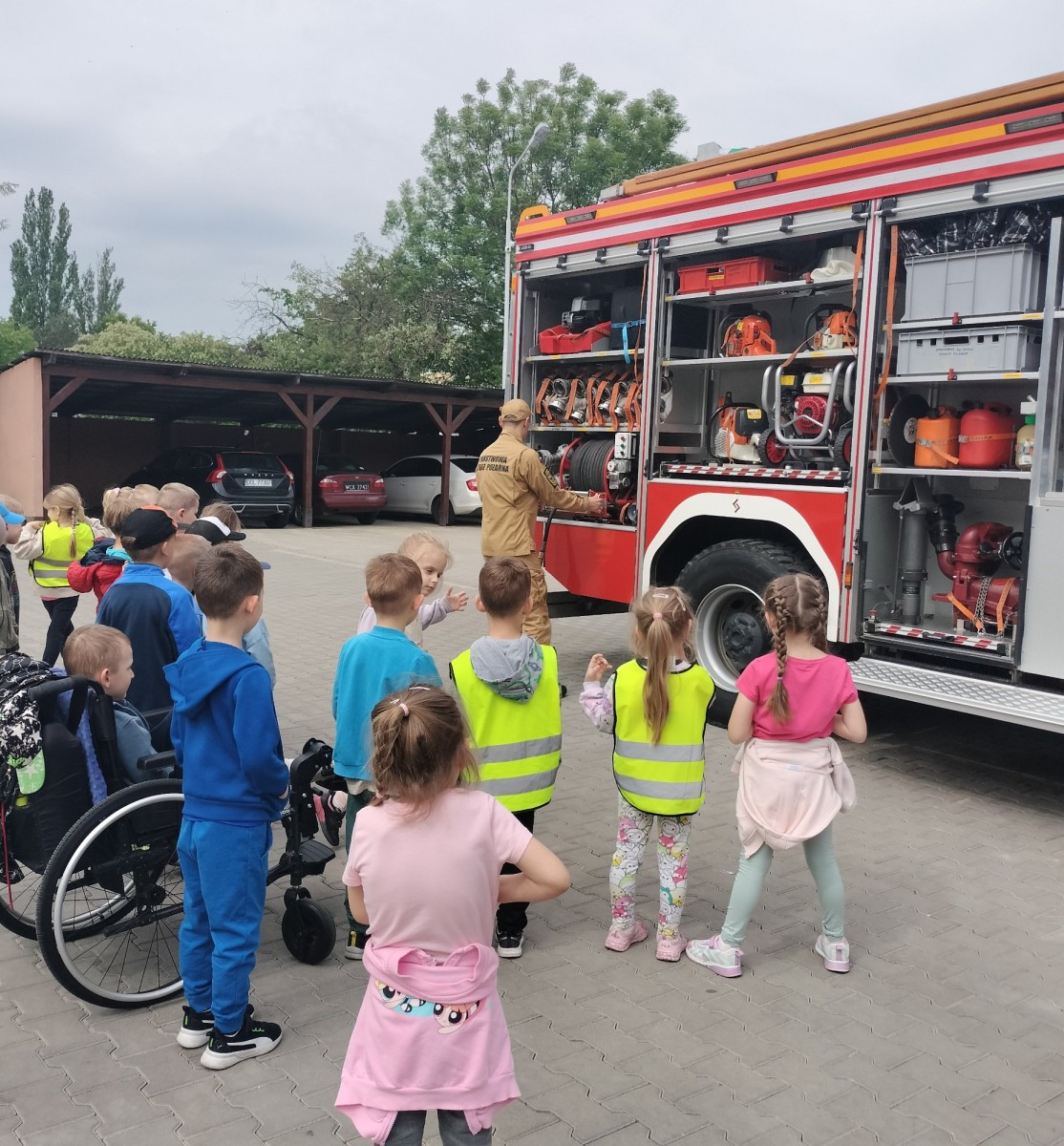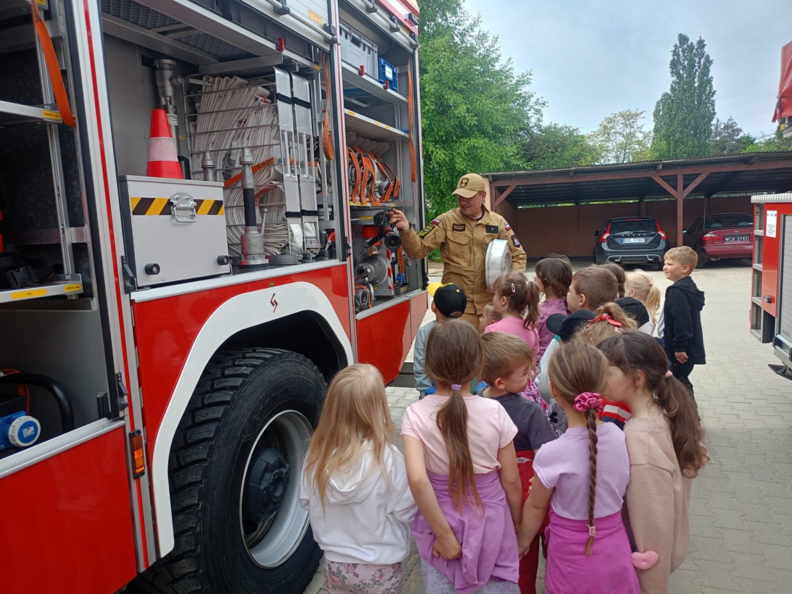 W dniu 21 maja dzieci z grup Nutki i Puchatki wybrały się na wycieczkę do Komendy Powiatowej Państwowej Straży Pożarnej w Oleśnicy. Dzięki życzliwości strażaków przedszkolaki obejrzały wozy strażackie i sprzęt pożarniczy stanowiący wyposażenie jednostki. Wszyscy chętni mogli również sprawdzić się w roli strażaka, trzymając w rękach prawdziwy wąż strażacki.
