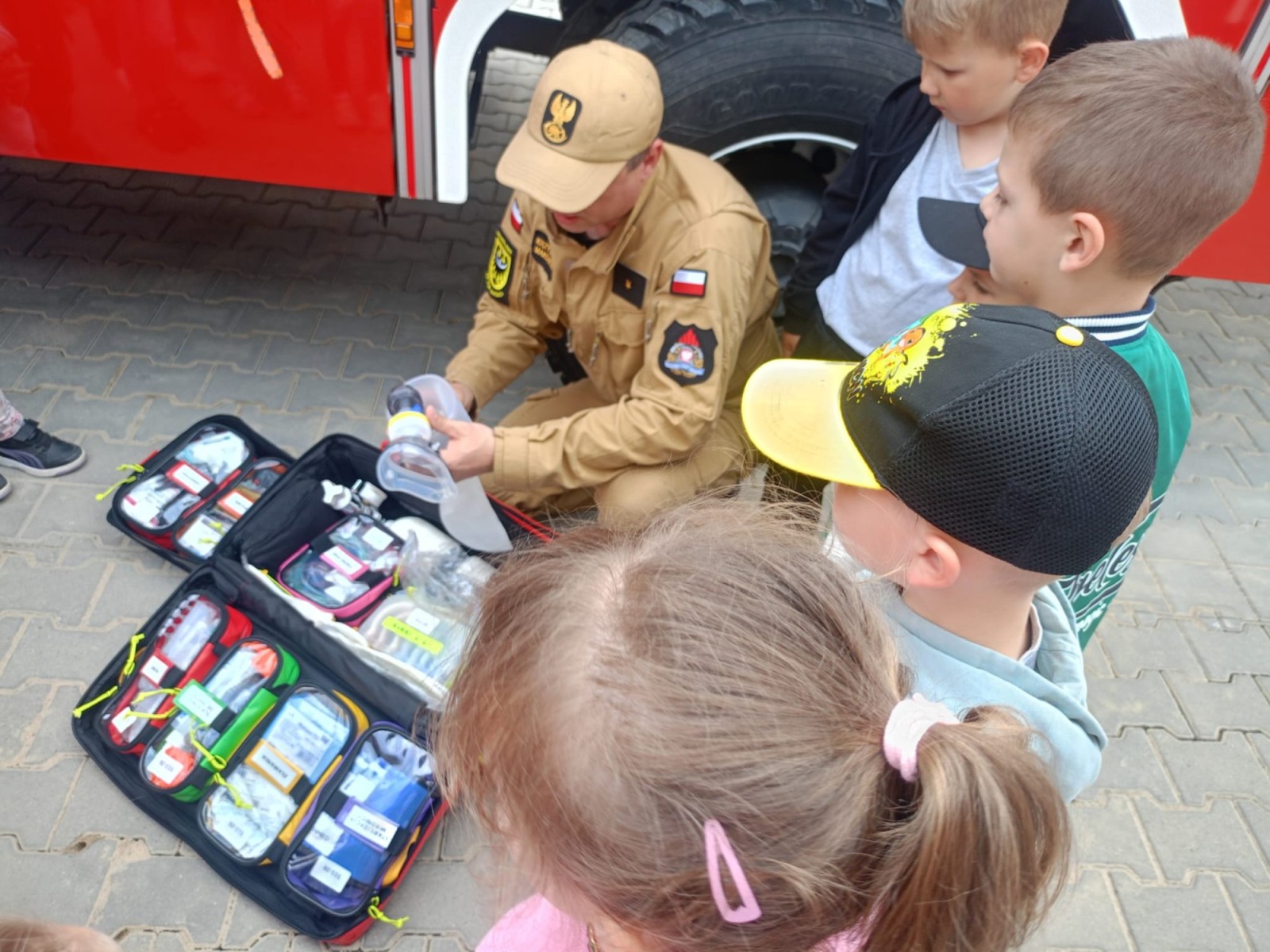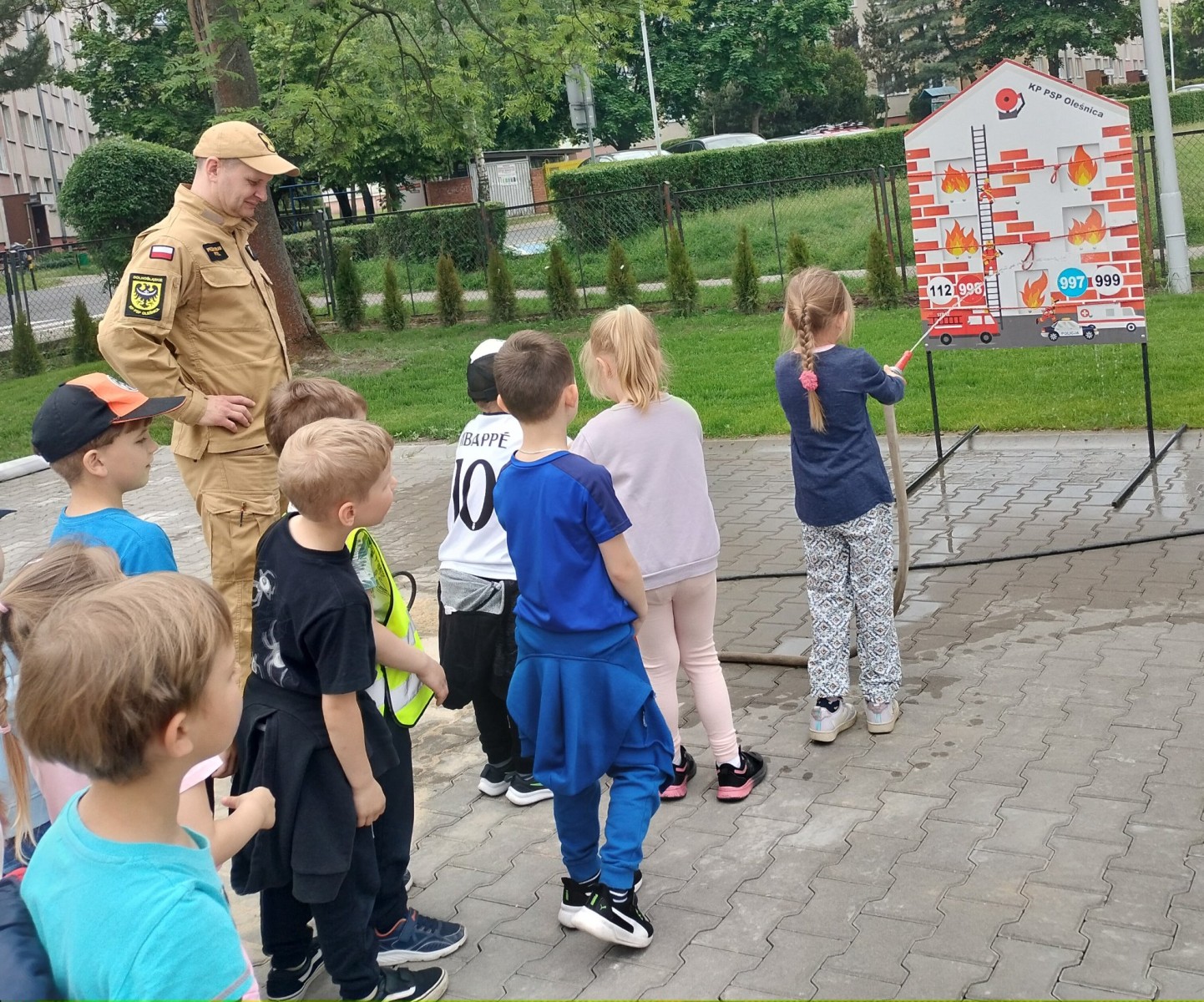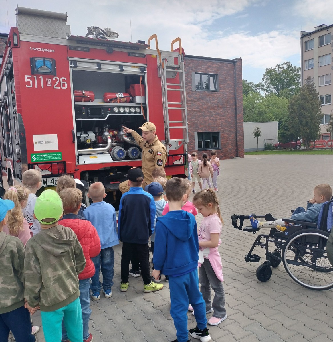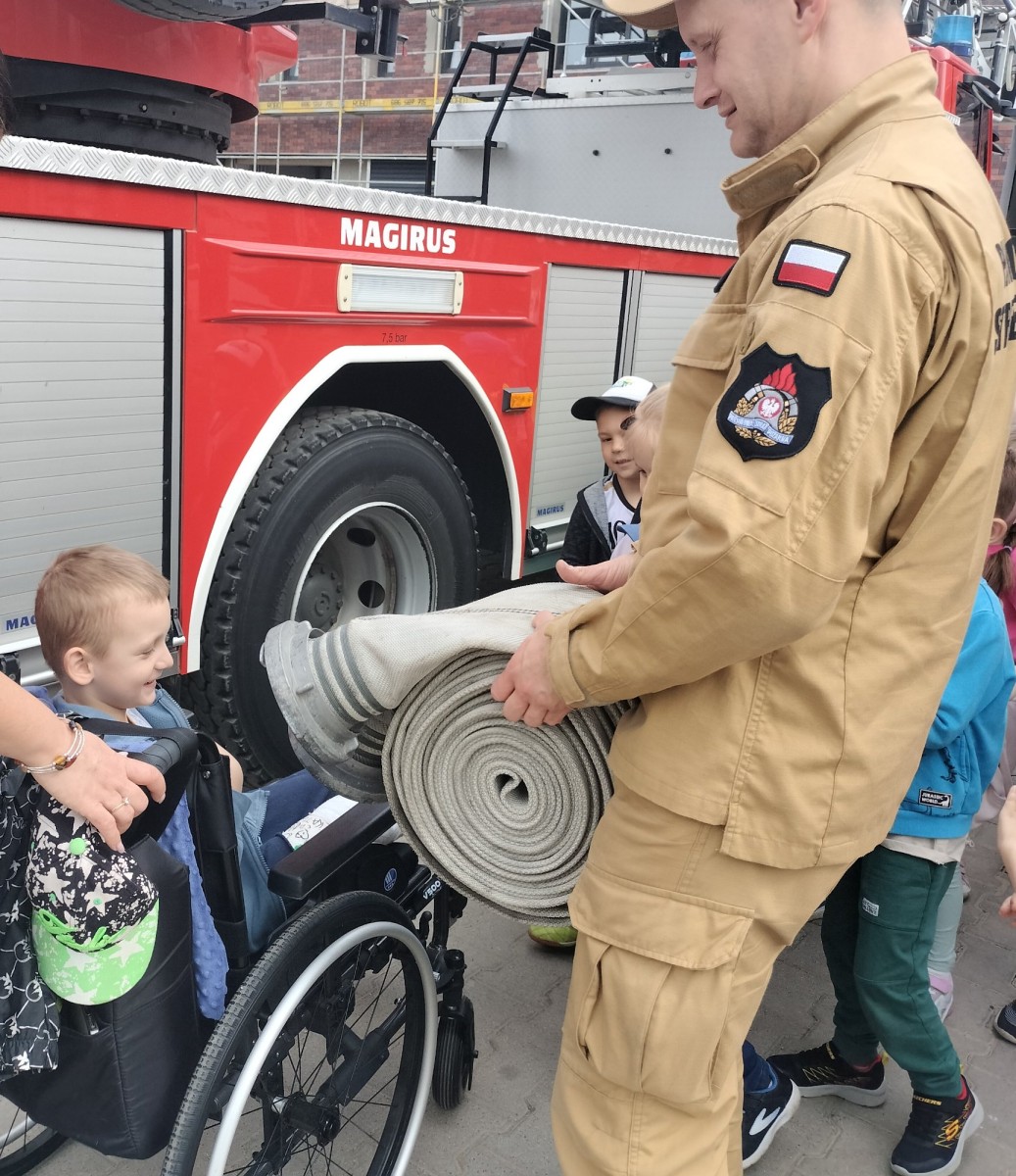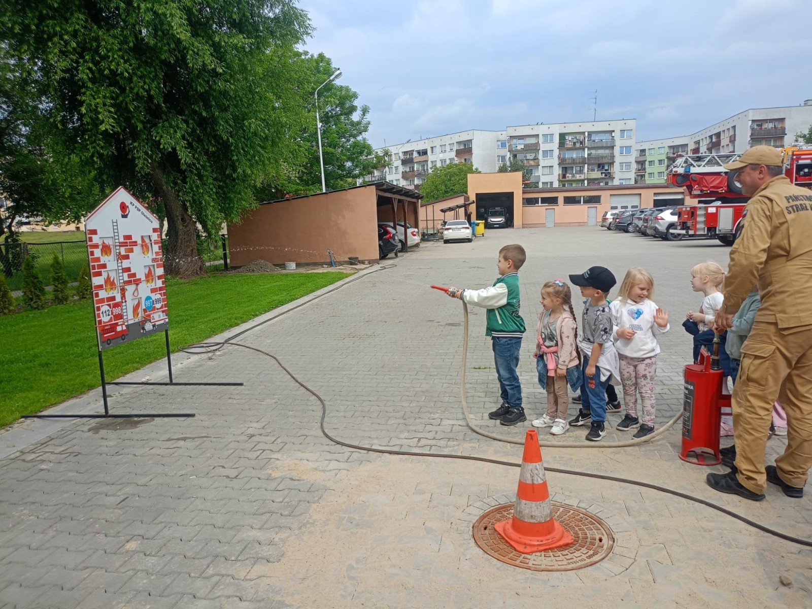 W dniu 21 maja dzieci z grup Nutki i Puchatki wybrały się na wycieczkę do Komendy Powiatowej Państwowej Straży Pożarnej w Oleśnicy. Dzięki życzliwości strażaków przedszkolaki obejrzały wozy strażackie i sprzęt pożarniczy stanowiący wyposażenie jednostki. Wszyscy chętni mogli również sprawdzić się w roli strażaka, trzymając w rękach prawdziwy wąż strażacki.