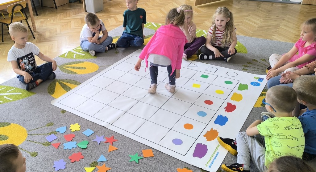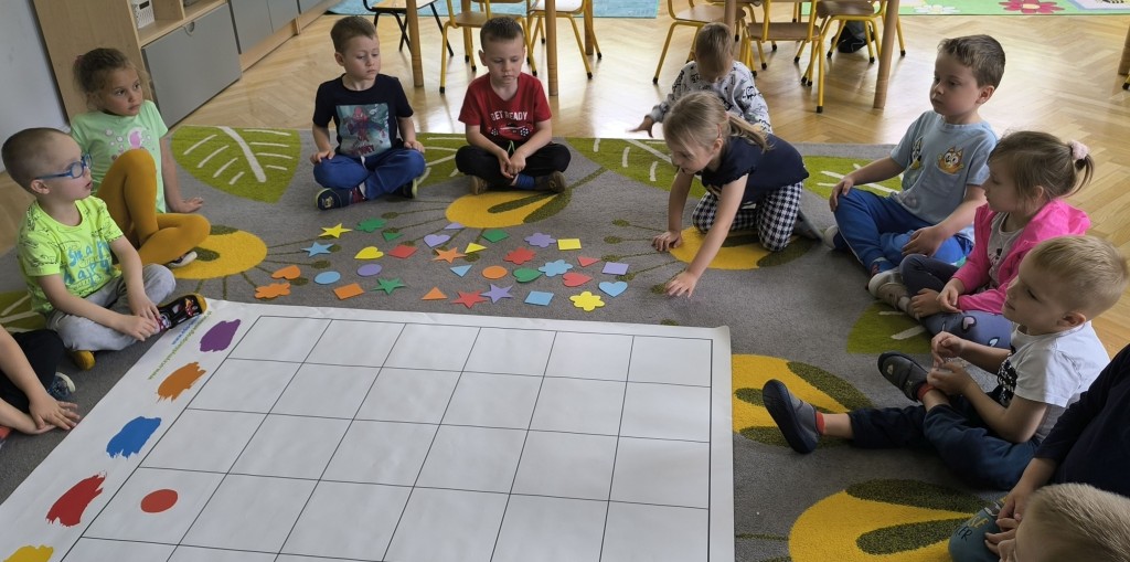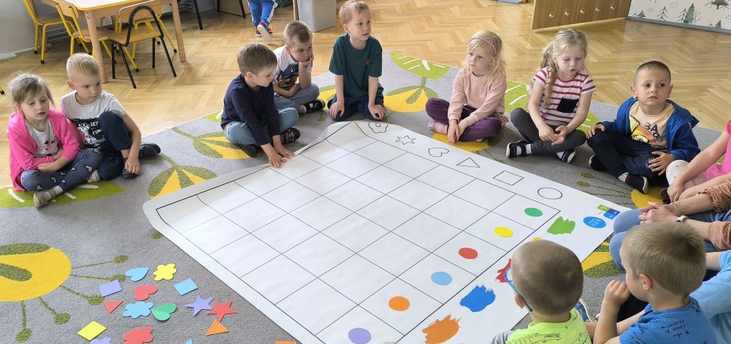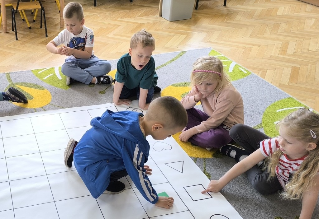 Dzieci czteroletnie z grupy Ekoludki aktywnie uczestniczyły w zajęciach z kodowania. Zabawa w kodowanie z wykorzystaniem maty sprawiła dzieciom wiele radości. Starszaki doskonaliły logiczne myślenie, rozumowanie i wnioskowanie. Tworzyły sekwencje ruchów prz pomocy symboli: kształtów i figur.