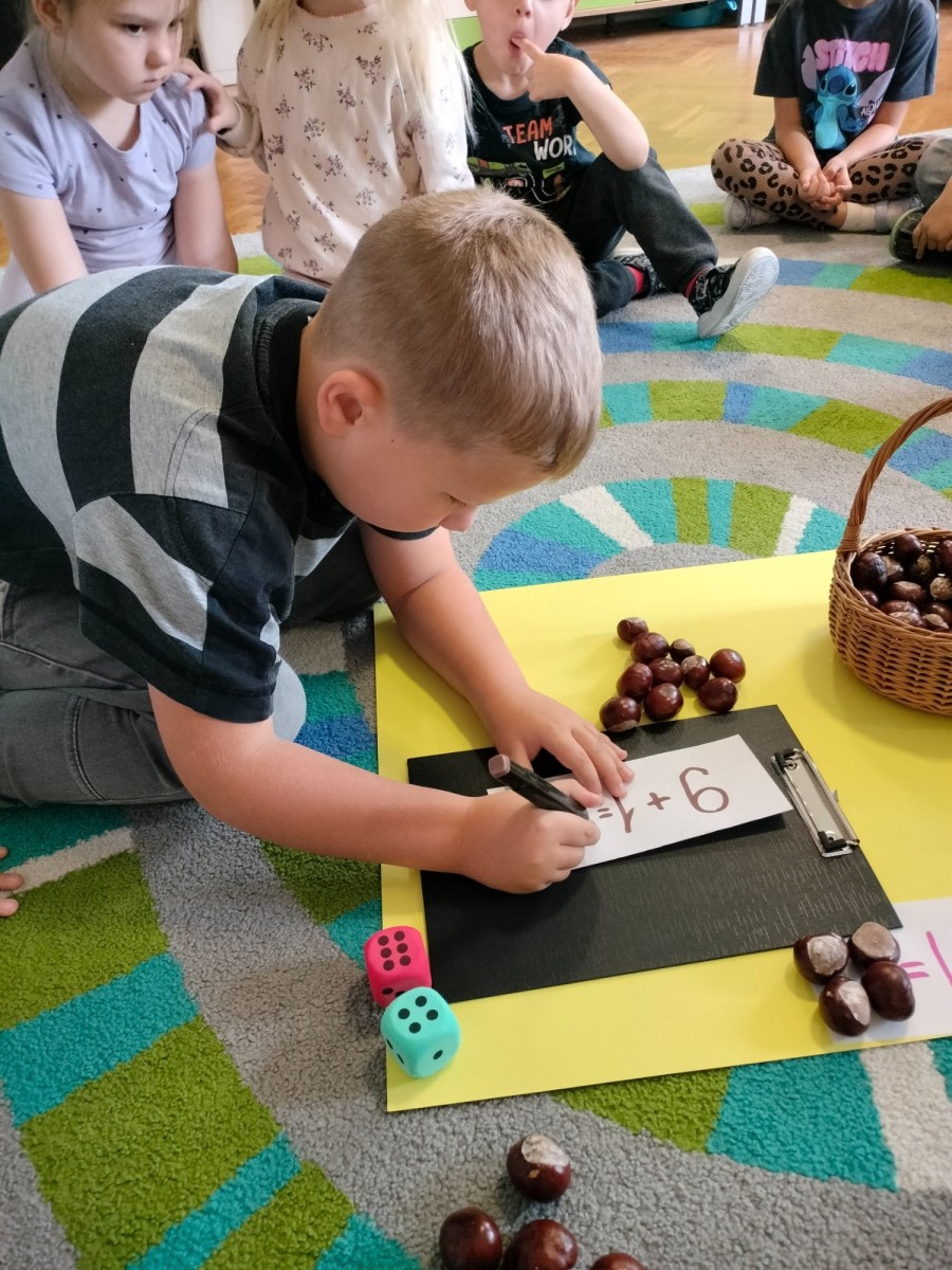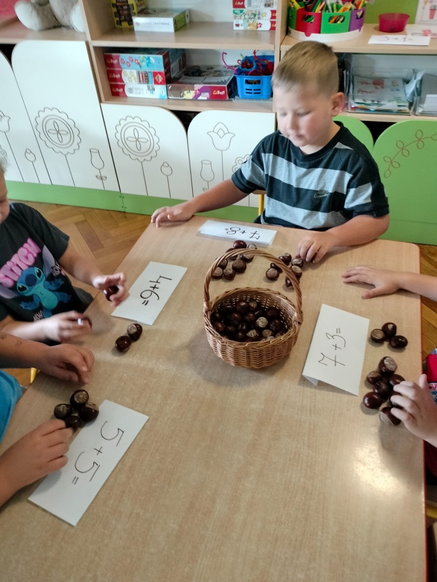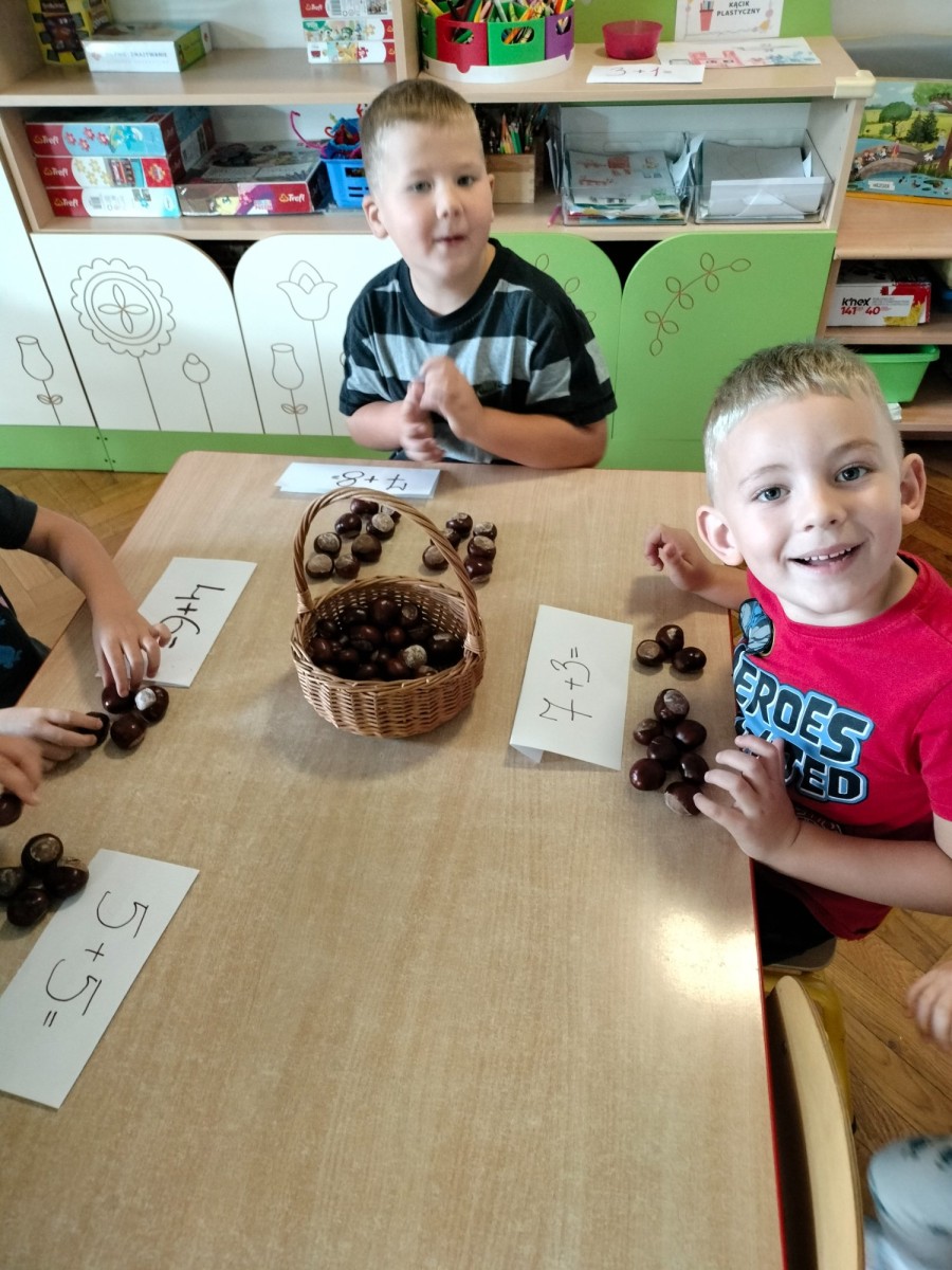 Kasztany posłużyły Nutkom jako materiał manipulacyjny, który pomógł im wizualizować i lepiej przyswajać abstrakcyjne działania matematyczne poprzez zabawę.