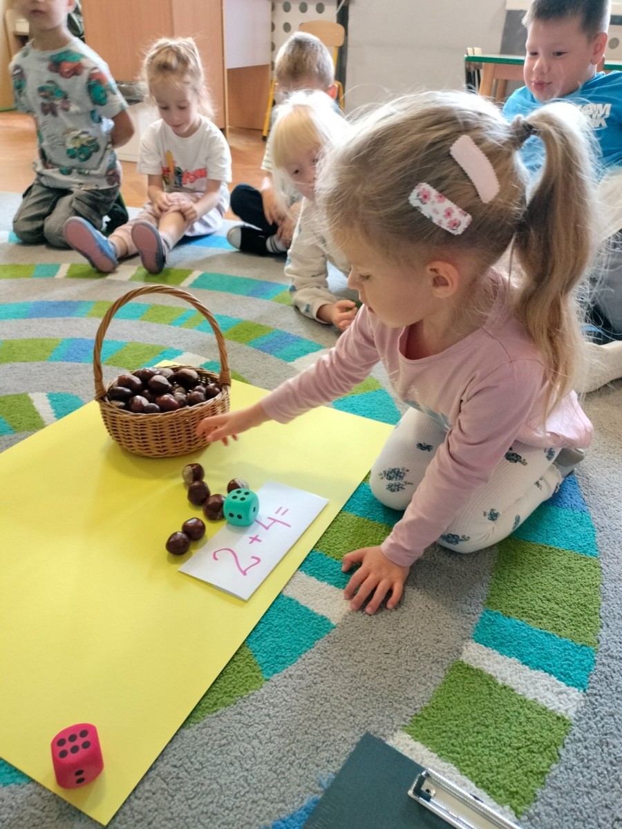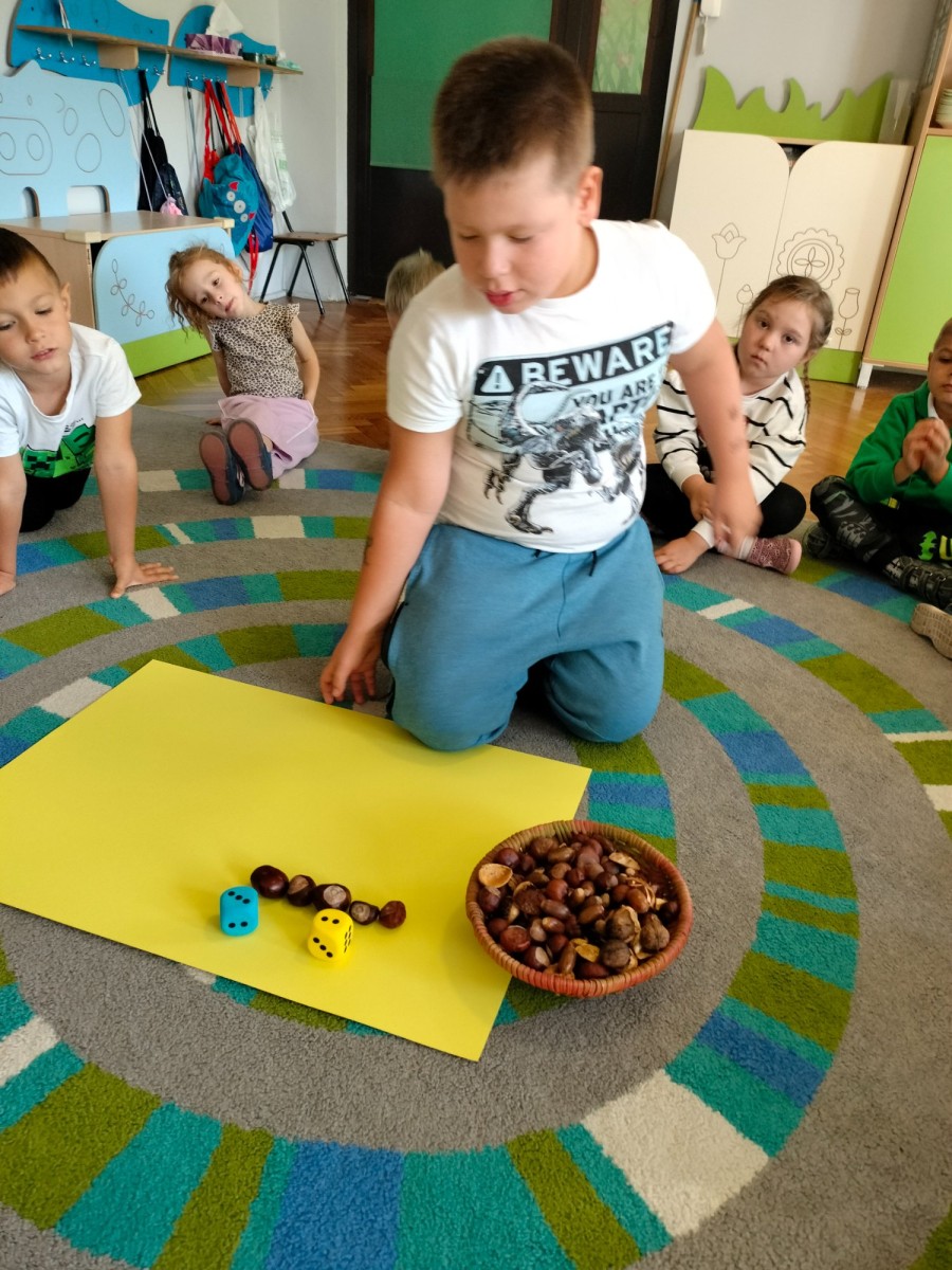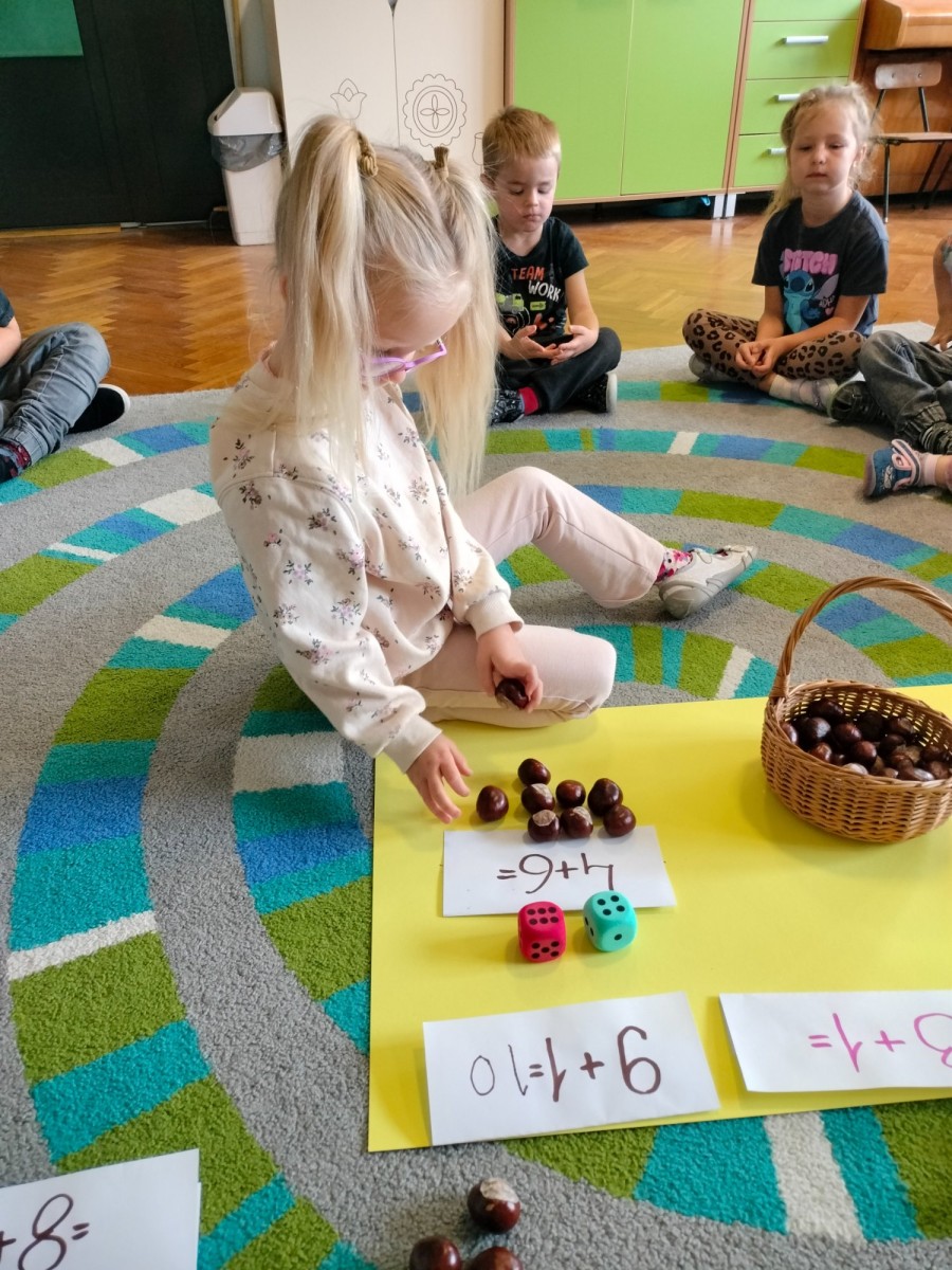 Kasztany posłużyły Nutkom jako materiał manipulacyjny, który pomógł im wizualizować i lepiej przyswajać abstrakcyjne działania matematyczne poprzez zabawę.