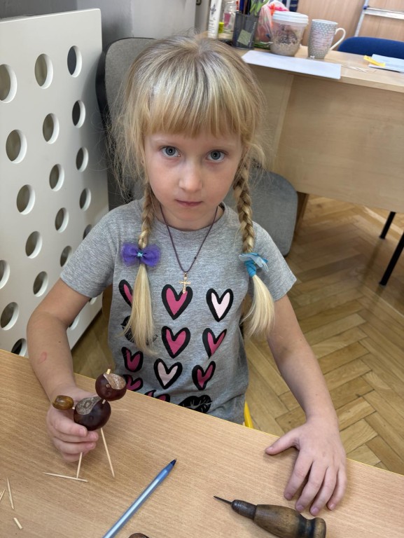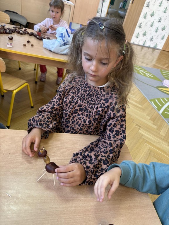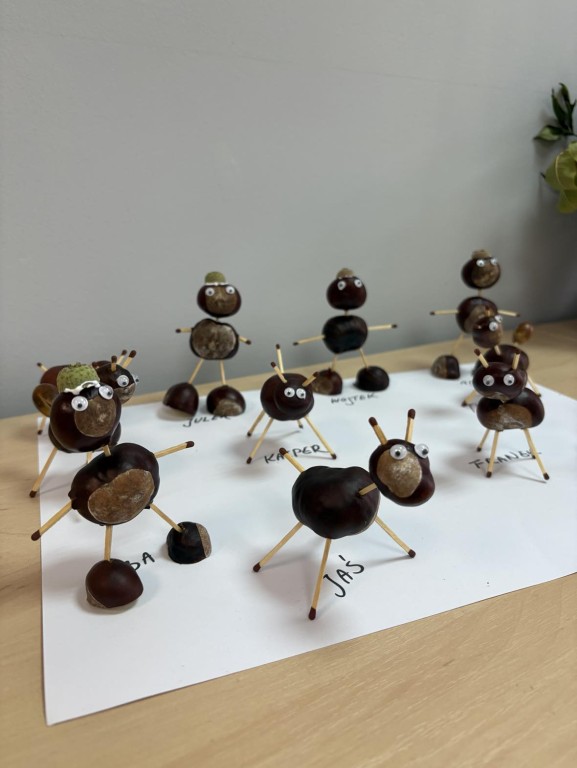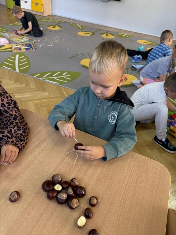 Czterolatki z grupy Ekoludki zgromadziły w kąciku przyrody dużo darów jesieni, a z kasztanów powstały piękne ludziki.