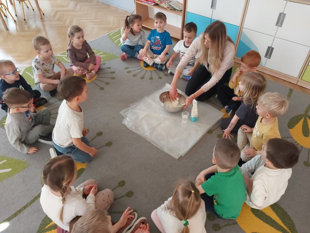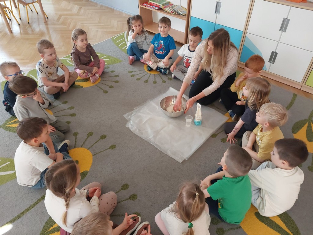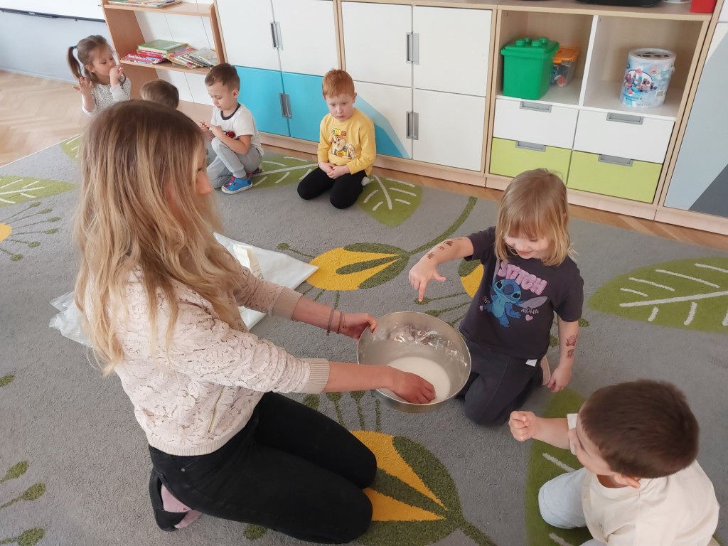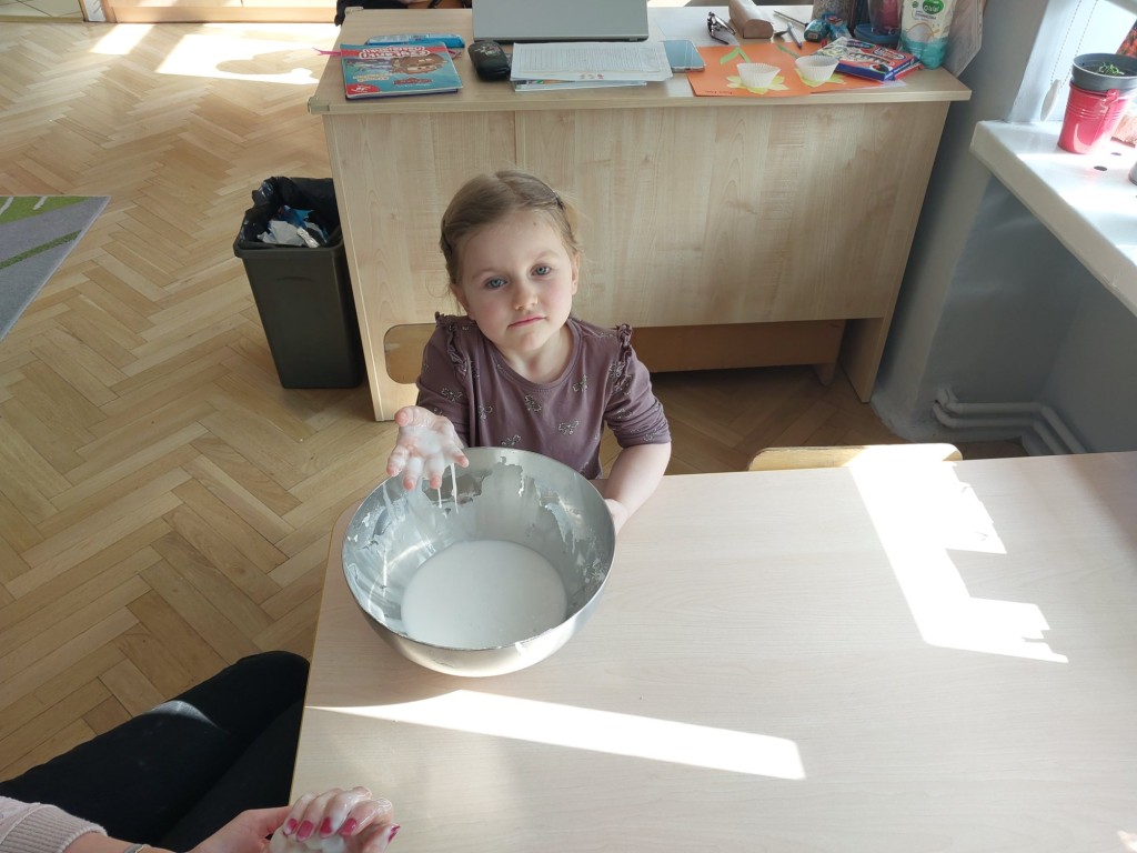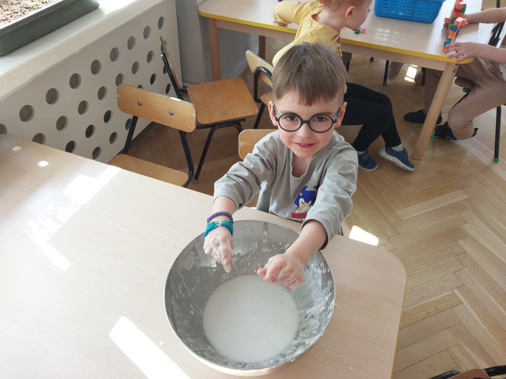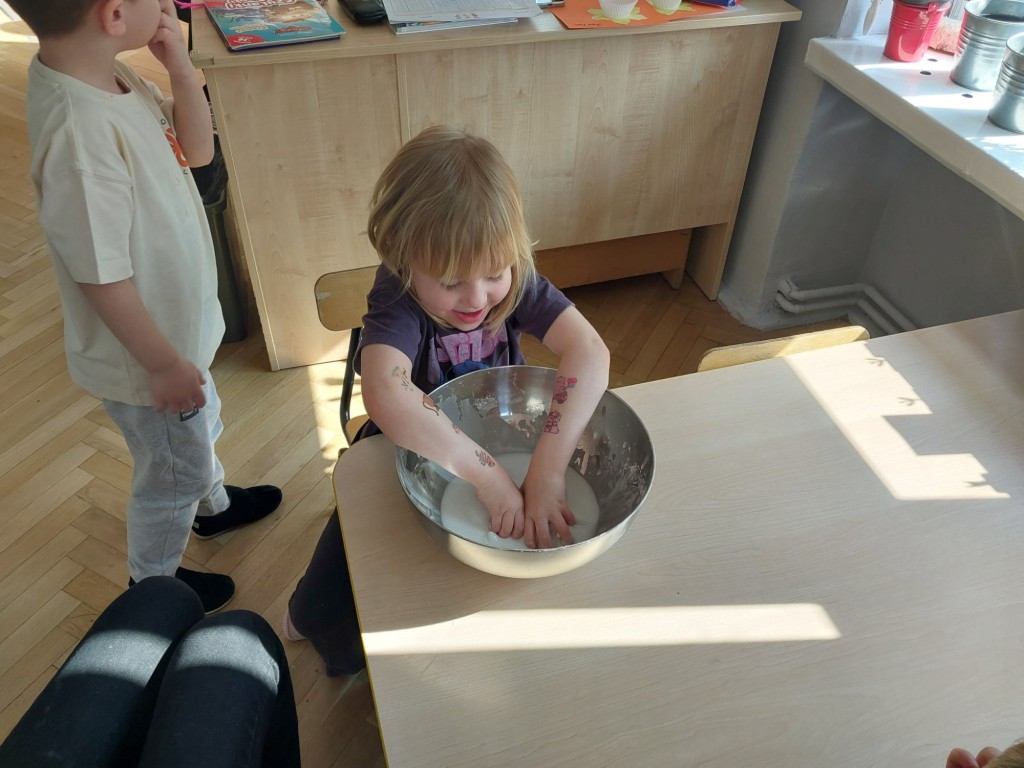 W tym tygodniu dzieci z grupy Krasnale tworzyły w nietypowy sposób kolorowy obraz oraz sprawdzały właściwości cieszy nienewtonowskiej.