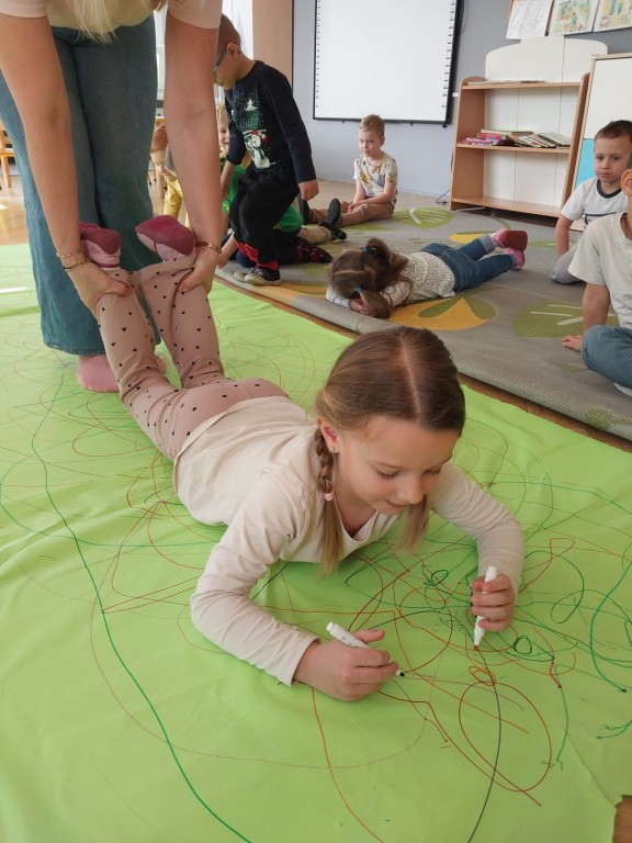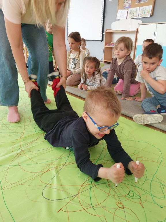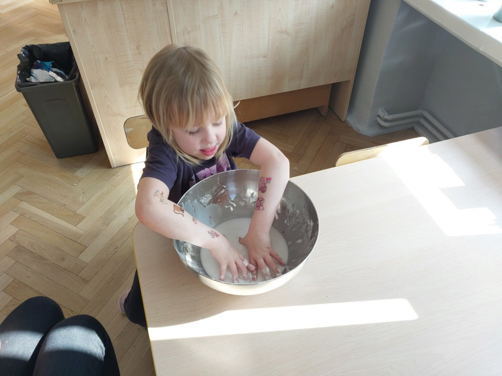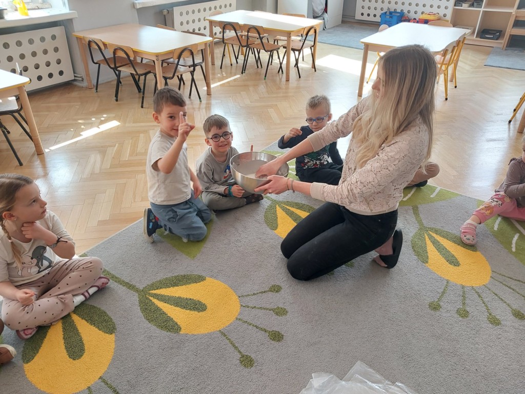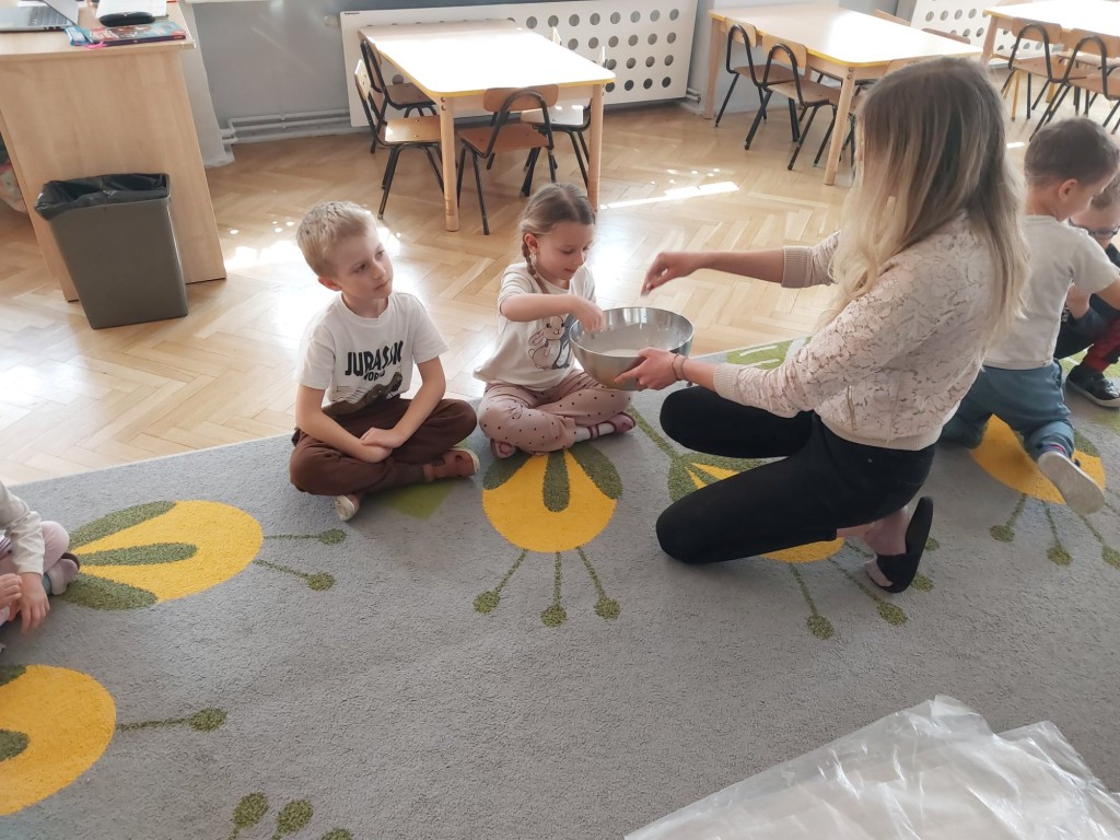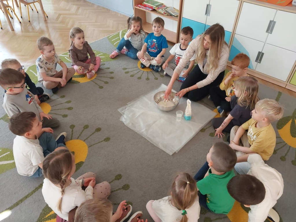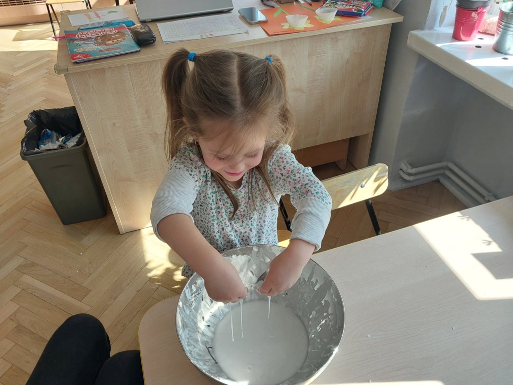 W tym tygodniu dzieci z grupy Krasnale tworzyły w nietypowy sposób kolorowy obraz oraz sprawdzały właściwości cieszy nienewtonowskiej.