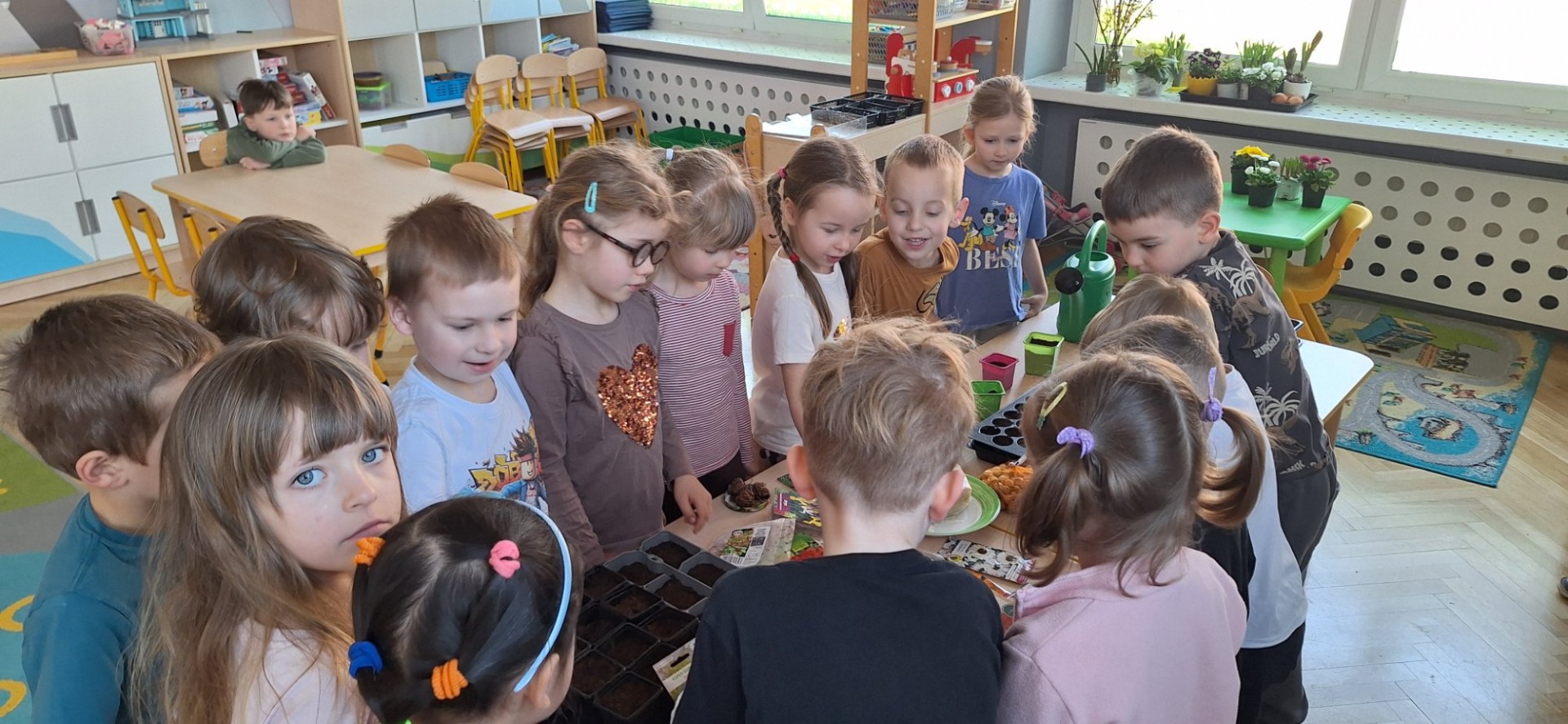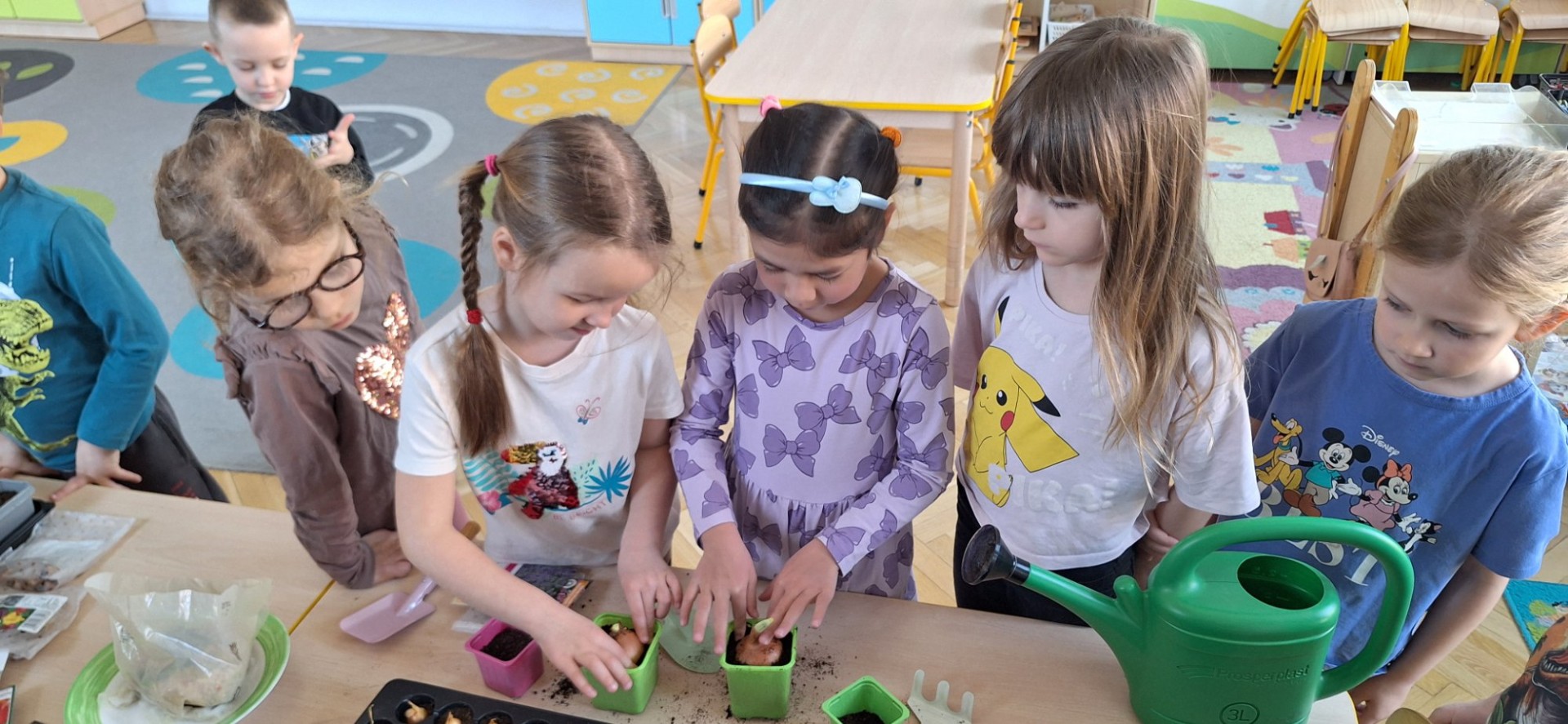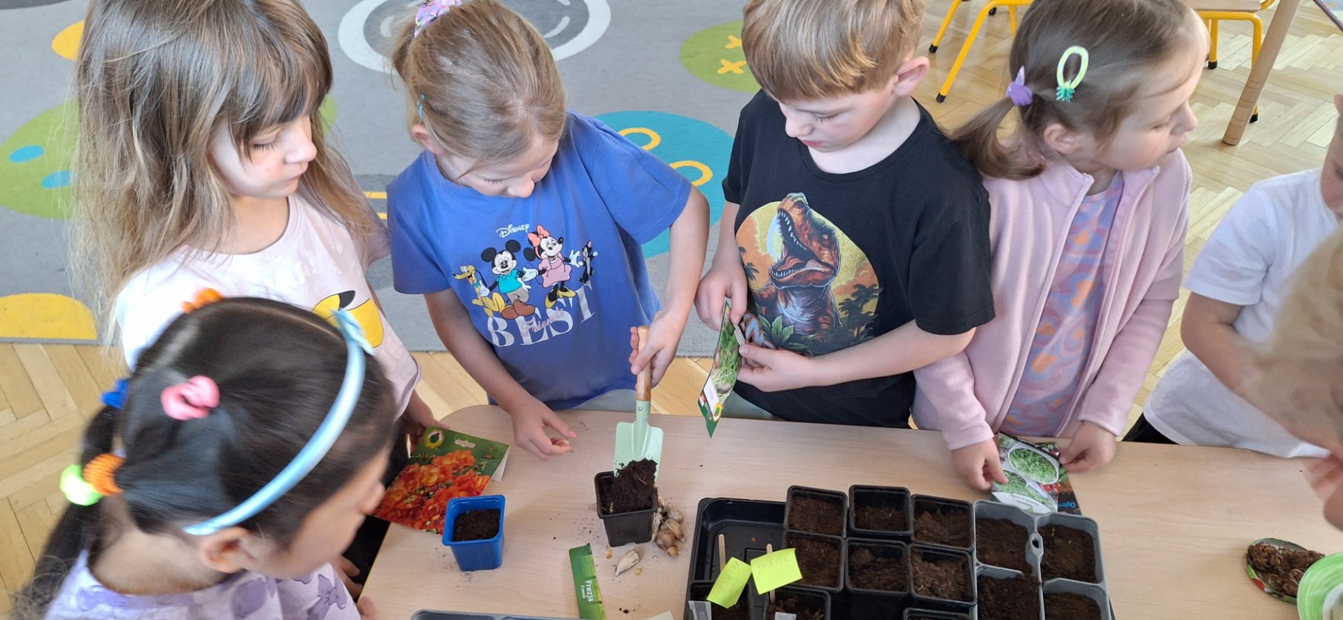 Dnia 19 marca dzieci z grupy „Biedronki” samodzielnie sadziły przyniesione nasiona oraz cebulki kwiatów, ziół i warzyw. Przedszkolaki z dużym zaangażowaniem uczestniczyły w zajęciach, ucząc się, jak dbać o rośliny i obserwować ich rozwój. Codziennie podlewają swoje uprawy i z ciekawością wypatrują pierwszych zielonych pędów.