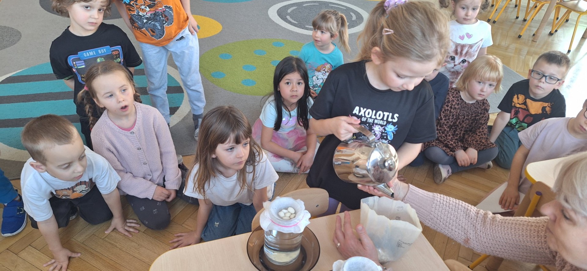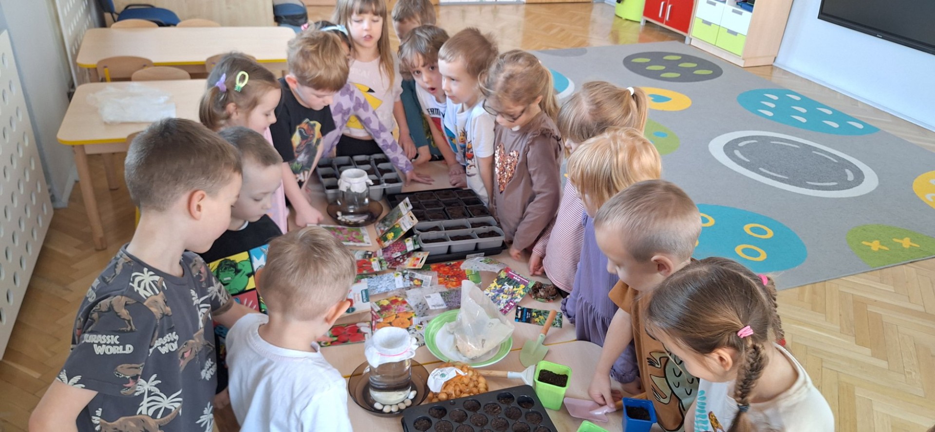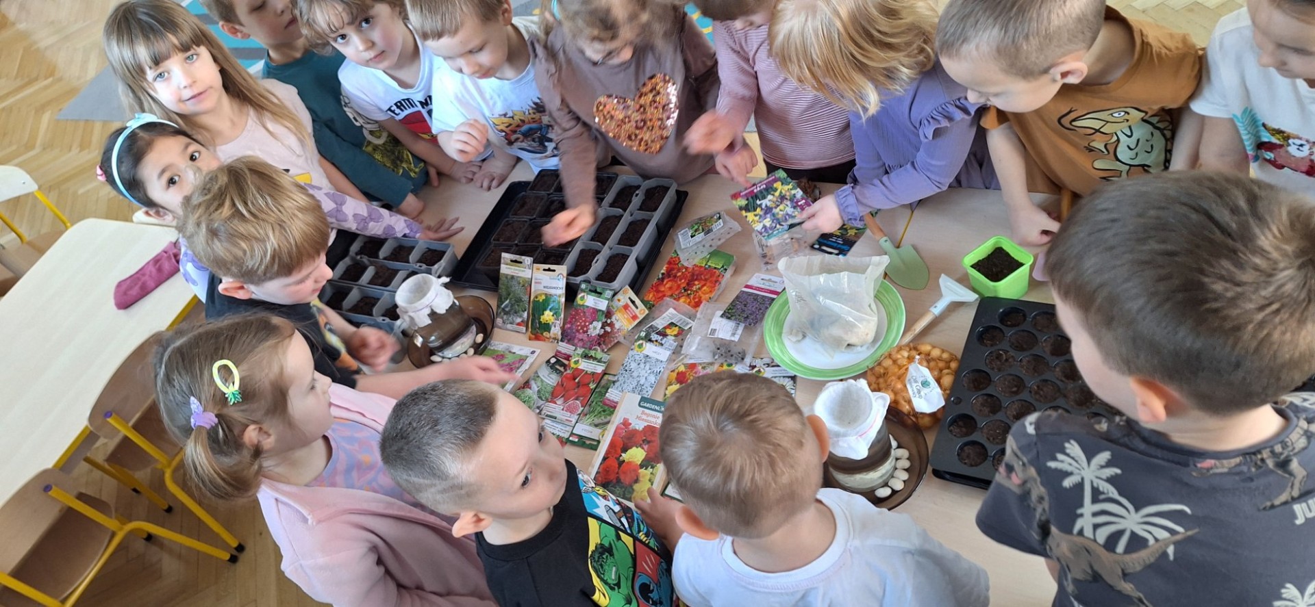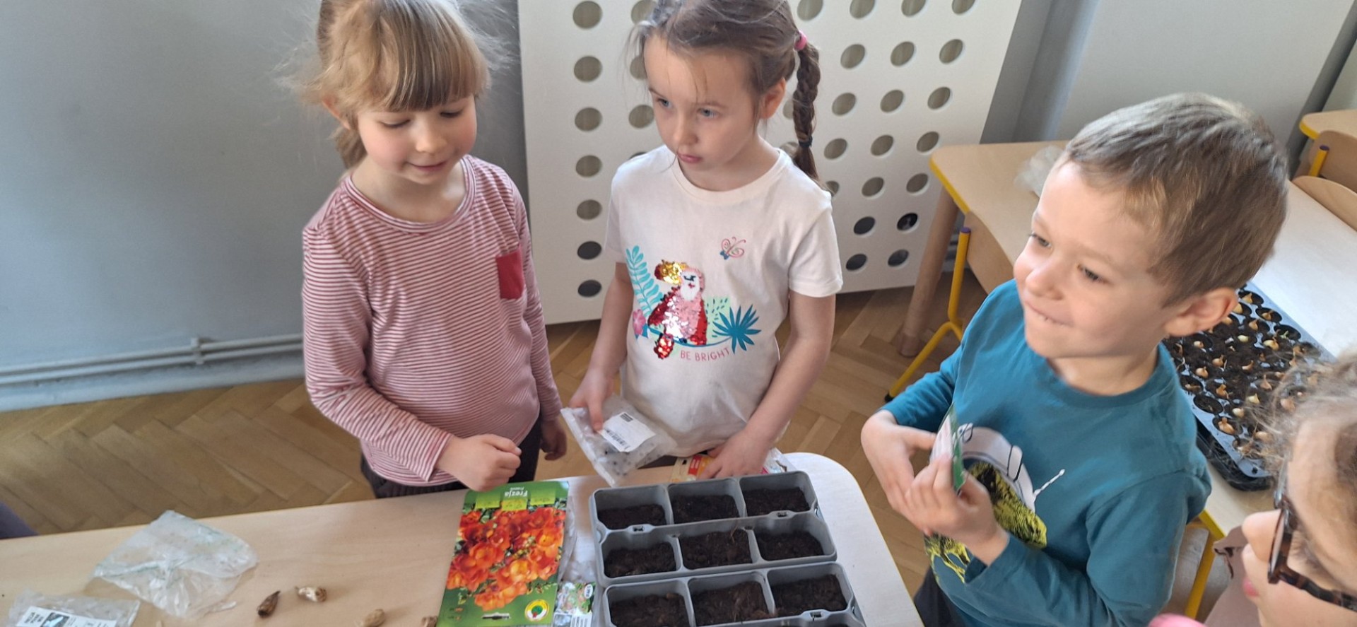 Dnia 19 marca dzieci z grupy „Biedronki” samodzielnie sadziły przyniesione nasiona oraz cebulki kwiatów, ziół i warzyw. Przedszkolaki z dużym zaangażowaniem uczestniczyły w zajęciach, ucząc się, jak dbać o rośliny i obserwować ich rozwój. Codziennie podlewają swoje uprawy i z ciekawością wypatrują pierwszych zielonych pędów.